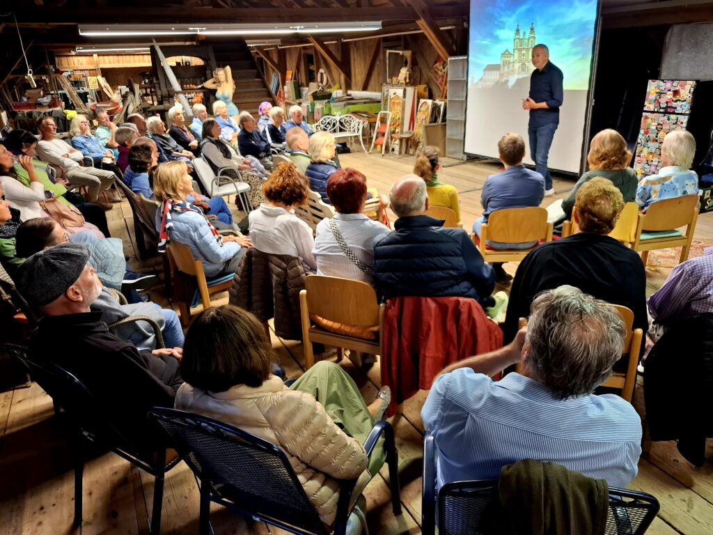 Rund 50 Mitglieder folgten der Einladung und genossen einen spätsommerlichen Abend in Jost und Maria Bergers zauberhafter Wunderwelt. Gemeinsam sah man sich einen humorvollen Film an, über den im Anschluss bei kühlen Getränken in der parkähnlichen Anlage der Herrenmühle angeregt diskutiert wurde.